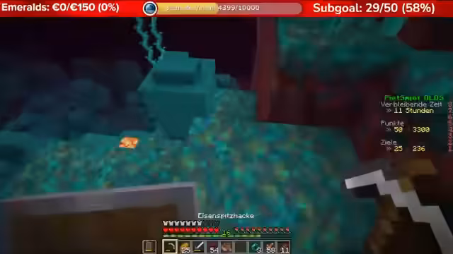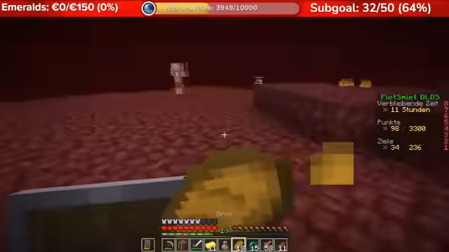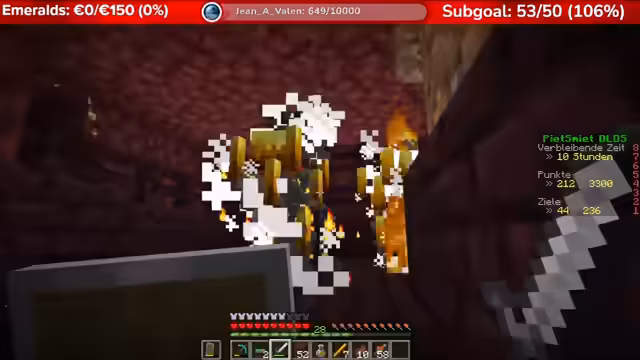 02:53:31Nach längerer Suche wurde endlich der Blaze-Spawner gefunden. Dies erforderte maximale Konzentration und vorsichtiges Vorgehen, um nicht in Fallen zu geraten oder Schaden durch andere Mobs wie Wither-Skelette zu nehmen. Mit den zuvor hergestellten Feuerresistenz-Tränken gestaltete sich der Kampf um die acht benötigten Blaze Ruten wesentlich einfacher. Die Mobs wurden systematisch bekämpft und die Ruten eingesammelt. Gleichzeitig sammelte das Team weiter Gold ein, um später Obsidian für den Rückweg zu handeln, und stieg dadurch in der Rangliste auf Platz 9 auf.