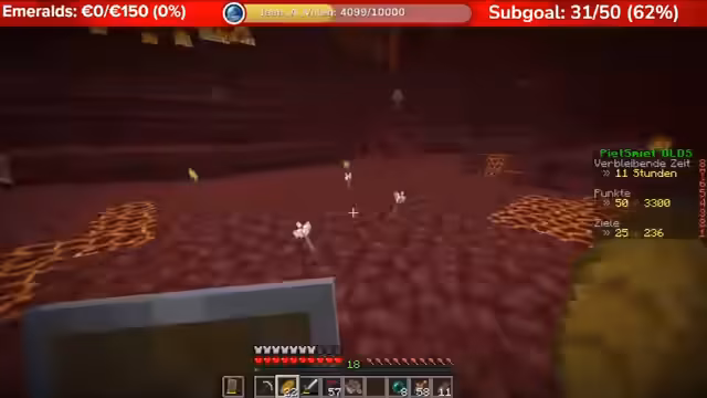 02:39:33Das Team hat einen Fortschritt erzielt und eine Netherite-Aufwertung sowie fünf Diamanten eingesammelt. Mit 178 Punkten wird spekuliert, ob sie bald 200 erreichen werden. Die vielen Garst stellen eine Herausforderung dar, aber das Team plant, das aktuelle Biom zu verlassen, da es einfacher zu durchqueren ist als das vorherige. Vorsicht ist geboten wegen Lava-Löchern, aber bei gutem Bauen sollte es machbar sein. Gas-Angriffe sind zu erwarten, daher wird ein Bogen mit Pfeilen vorbereitet. Ein Magma-Blob wird getroffen, aber stellt keine große Gefahr dar. Das aktuelle Biom erweist sich als riesig, was die Suche nach einer Festung erschwert. Das Team versucht, seitlich aus dem Biom herauszukommen, um Bogenschützen zu vermeiden. Es wird festgestellt, dass zwei Strukturen gefunden wurden, beides Bastionen, was als Pech angesehen wird, da Festungen benötigt werden. Da bereits ein Upgrade vorhanden ist, werden keine weiteren aus den Bastionen benötigt, da diese mit Dias vermehrt werden können. Ein Raid von Holla wird erwähnt und das Team befindet sich aktuell auf Platz 11, fast in den Top 10. Das Ziel, eine Festung zu finden, bleibt bestehen, aber das riesige Biom erschwert die Suche erheblich.