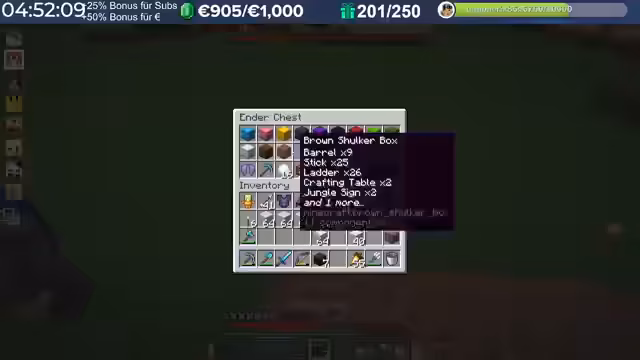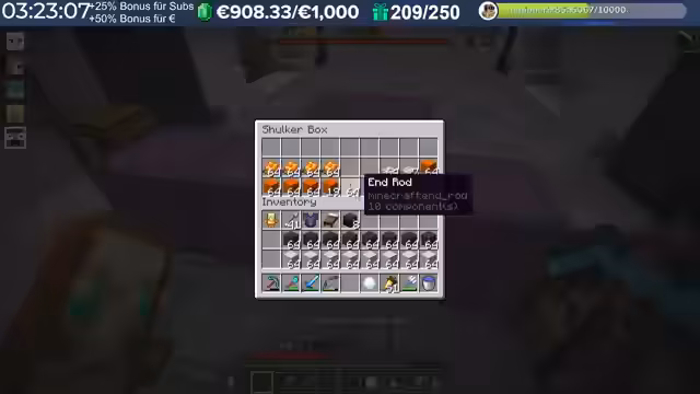 17:46:05Nach der Diskussion über Games setzt der Streamer seine Endtour fort. Er lootet weitere End Cities und sammelt Ressourcen wie Endrods und Schalkerboxen. Ein wesentlicher Fokus liegt auf der Organisation der gesammelten Materialien in einem neu aufgebauten Enderkisten-System. Dieses System soll das effiziente Transportieren und Lagern von Ressourcen wie Raketen und Werkzeugen erheblich verbessern.