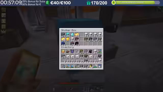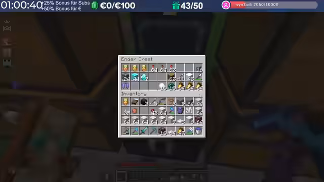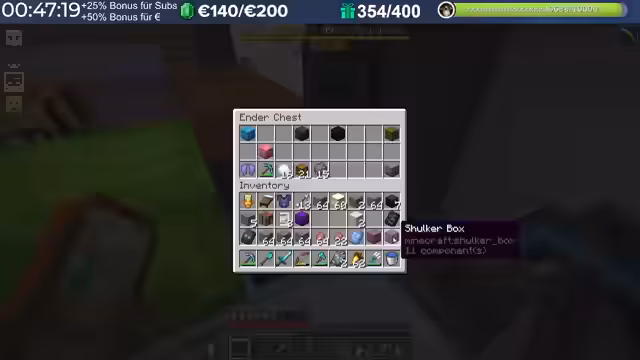 16:43:16Der Streamer startet eine Sammeltour im End, um dringend benötigte Schalkerboxen zu organisieren. Er benutzt eine Elytra für schnelle Fortbewegung und sammelt Items wie Endrods und Enderkisten aus verschiedenen Kisten und Schiffen. Die Strategie ist, effizient Loot aus den Plätzen zu ziehen und ihn an einer sicheren Basis zu lagern.