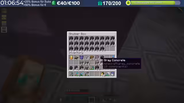 02:00:09Ein Teil der Stream-Zeit widmet sich dem Überblick über die individuellen Fortschritte der Teilnehmer. Während einige Spieler komplexe Bauten mit enormen Mengen an Materialien wie Tausenden von Blöcken Beton und Glas realisieren, fühlt sich der Streamer selbst im Vergleich zu den Minecraft-Experten im Rückstand. Hauptproblem ist der immense Aufwand für die Materialbeschaffung, insbesondere das Färben von Kies für Beton, was als sehr aufwendig und frustrierend beschrieben wird.