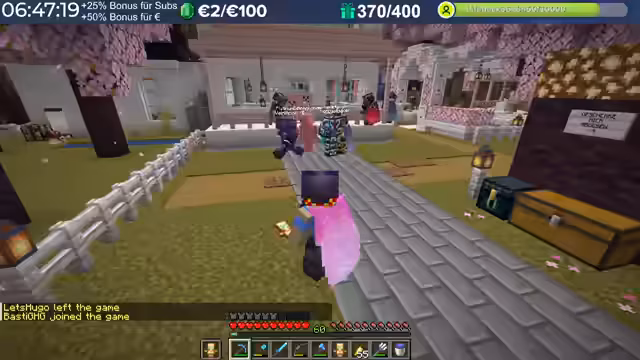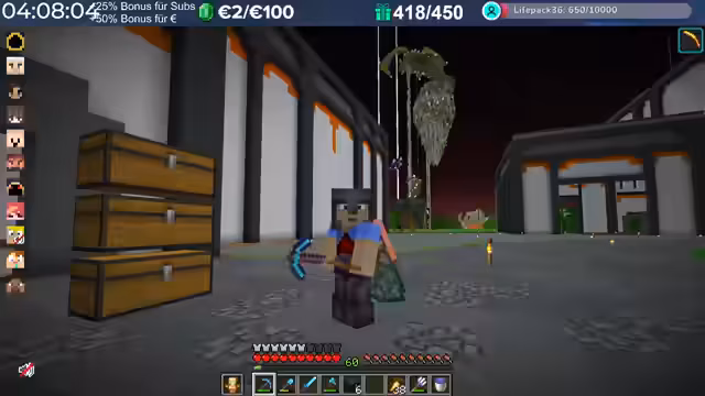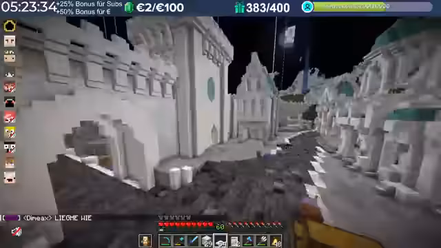 02:24:23Auf die Frage, was in den letzten zwei Tagen passiert ist, wird humorvoll geantwortet, dass Gronkh und PewDiePie auf dem Server waren und alle von Mojang nach Schweden eingeladen wurden, um einen eigenen In-Game-Skin und ein Cape zu erhalten. Peter Jackson, der Autor von Herr der Ringe, soll gedroht haben, die Base wegen Copyright-Verletzungen zu striken – all dies wird als 'normaler Tag' zusammengefasst. Später wird über die Herausforderung gesprochen, Häuser schräg zu bauen, und ein 'komischer Turm' wird als 'krumm und schief' beschrieben. Es wird erwähnt, dass eine Quartz Training Hall gebaut wurde und dass bei Solo-Basen die Zusammenarbeit mit anderen schneller zum Erfolg führt. Eine eigene Trading Hall soll in den nächsten Tagen folgen. Es wird überlegt, ob eine Fassade verschoben werden sollte, um Symmetrie zu erreichen, und die Notwendigkeit von Froglights wird angesprochen, wobei deren Beschaffung als schwierig eingeschätzt wird, da der entsprechende Shop leer ist.