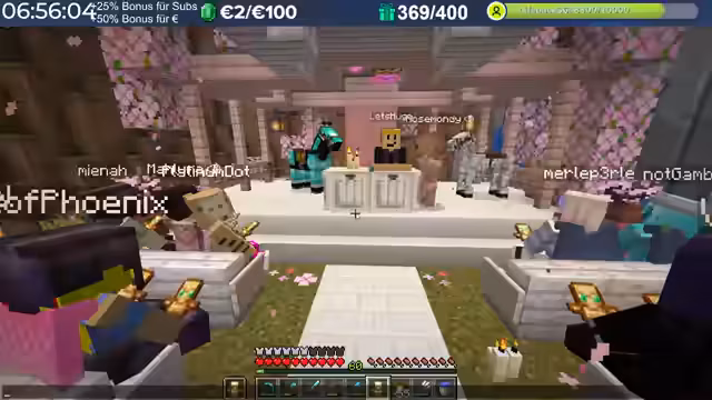 01:32:20Während der Hochzeitszeremonie fragt der Priester, ob jemand Einwände gegen die Ehe hat. Überraschenderweise meldet sich Ferdinand, Tiramisus totgeglaubter Geliebter, der plötzlich auftaucht und die Hochzeit unterbricht. Dies führt zu einem emotionalen Chaos und dem abrupten Ende der Zeremonie. Die Spieler sind schockiert und amüsiert zugleich über die unerwartete Wendung. Nach dem turbulenten Ereignis kehren die Spieler zu ihren Bauprojekten zurück. Es werden Aufgaben für den Bau von Häusern auf verschiedenen Ebenen, Lampen, Wegen und Brücken verteilt. Materialien wie Diorit, Quarz und Pale Oak werden benötigt, und die Spieler werden aufgefordert, sich an den Bauarbeiten zu beteiligen. Es gibt Diskussionen über verschiedene Baustile und die Herausforderung, Gebäude ohne starke Kontraste in die bestehende Architektur von Minas Tirith zu integrieren. Einige Spieler überlegen, bestehende Gebäude abzureißen, um Platz für neue Kreationen zu schaffen.