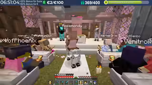 01:04:29Der Streamer nimmt an einem Community-Event teil - einer kurdischen Pferdehochzeit im Craft Attack. Er erwähnt den Dresscode und dass man Diamanten als Geschenk mitbringen soll. Obwohl der Streamer zunächst skeptisch ist, beschließt er teilzunehmen, als er sieht, dass viele Spieler anwesend sind. Er holt schnell Diamanten ab und portiert sich zum Eventort. Der Streamer zeigt sich begeistert von der Vielfalt der Events und der kreativen Ideen der Community.