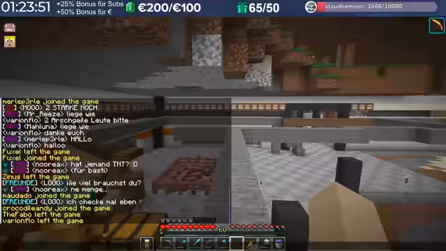 02:23:47Ein Benutzer namens 'unruhe stifter' hat TNT unter den Gebäuden platziert und alles gesprengt. Gronkh und PewDiePie waren auf dem Server, und alle Spieler wurden nach Schweden eingeladen, um eine Ehrenmedaille zu erhalten, inklusive eigener Skins und Capes. Es gab auch einen Vorfall mit dem Copyright-Strike für eine Base. Der Streamer erwähnt eine hohe Ausbeute in den zwei Tagen, in denen er nicht anwesend war.
