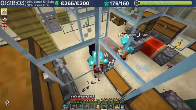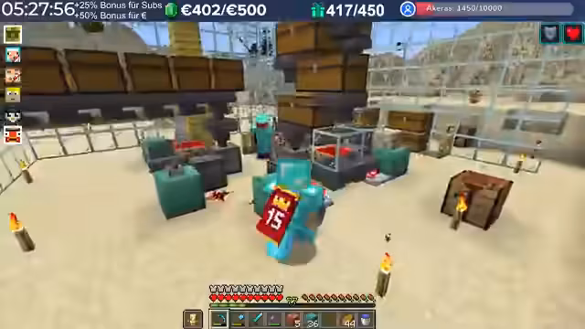 00:27:45Es wird über geplante neue Features für den Server gesprochen, die durch Community-Abstimmungen entschieden werden. Dazu gehören die Beschleunigung der Happy Ghasts und die Einführung einer Diamantenbank. Die Diamantenbank soll es Spielern ermöglichen, Diamanten einzuzahlen, abzuheben und damit zu handeln, um deren Wert und Prestige zu erhöhen. Der Streamer plant, diese Features auf dem Community-Server zu implementieren, sobald sie auf dem Original-Server verfügbar sind. Zudem wird ein Custom Shop System vorgestellt, das bereits existiert und den Kauf von Gegenständen mit Diamanten ermöglicht, wobei der Mindest- und Höchstzähler automatisch berechnet wird. Es gibt auch ein System zur Platzierung und zum Schutz von Basen, das jedoch noch kleinere Fehler aufweist, die behoben werden müssen.