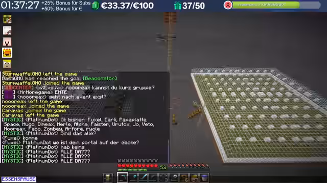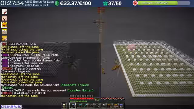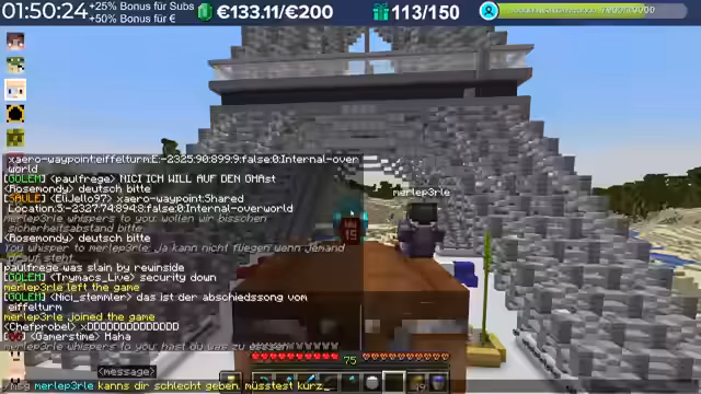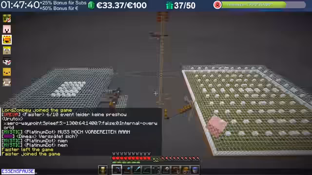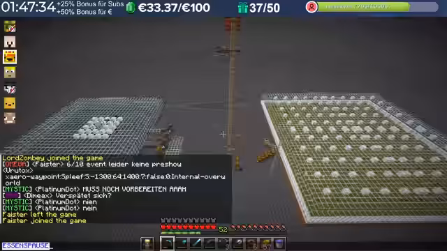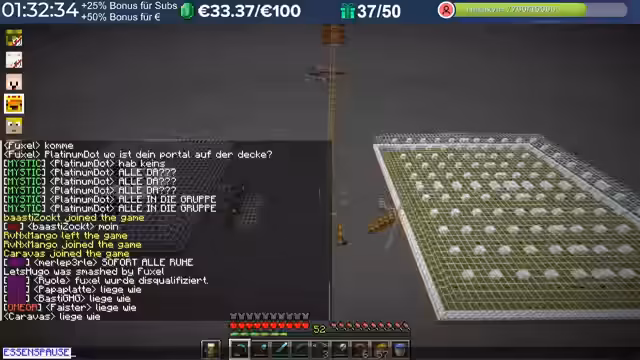 22:40:20Der Streamer hat technische Probleme mit einer Sprachaktivierung in Minecraft, die eine Roboterstimme den Chat vorlesen lässt. Es wird nach einer Lösung gesucht, um diese Funktion zu deaktivieren. Die Eröffnung des Eiffelturms wird für den nächsten Tag um 18 Uhr bestätigt, und die Streamer planen, sich bereits früher zu treffen. Nach einer kurzen Pause wird die Effizienz der Farmen überprüft. Es stellt sich heraus, dass die Ausbeute an Schießpulver und Tränen nicht so hoch ist wie erwartet, was auf die Kombination mit der Magma-Farm zurückgeführt wird. Es wird überlegt, den AFK-Spot zu verlegen, um die Farmen isoliert zu betreiben und die Effizienz zu steigern. Die Froglight-Ausbeute wird ebenfalls überprüft, wobei der Verdacht besteht, dass sich jemand Froglights entnommen hat.
