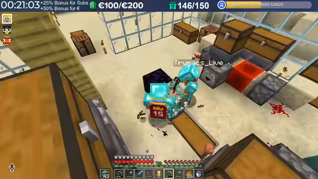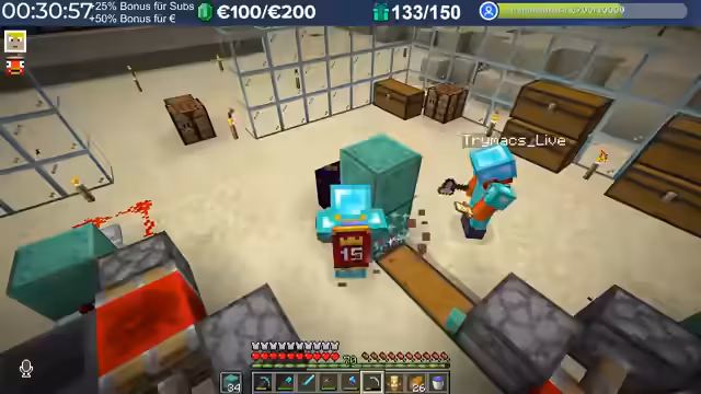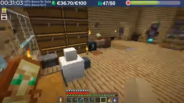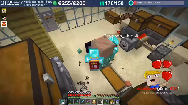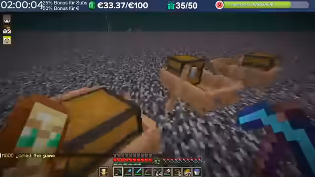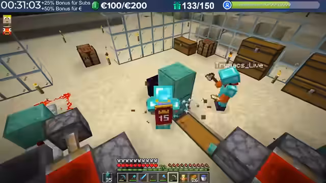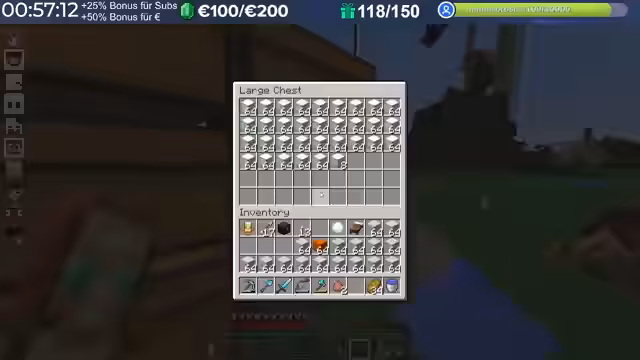 03:55:04Die Implementierung der Diamantenbank und des Shopping Districts wird vom Streamer übernommen, während die Deaktivierung des Raketen-Boosts und die Beschleunigung von Happy Gas von einem anderen Teammitglied (Erdi) umgesetzt werden. Der Streamer demonstriert eine einfache Version der Diamantenbank im Singleplayer-Modus mit Command-Blöcken, die das Ein- und Auszahlen von Diamanten ermöglicht und den Zähler über dem Namen aktualisiert. Die Herausforderung besteht darin, dies in einem Menü mit grafischer Oberfläche umzusetzen und sicherzustellen, dass keine Diamanten von anderen Spielern gestohlen werden können. Es wird ein Problem mit Base-Villagern behoben, die falsche Items in der Hand halten, was durch ein manuelles Zurücksetzen und ein schnelles Server-Update auf allen vier Servern gelöst wird, um einen Kontextfehler im Shop-System zu beheben.