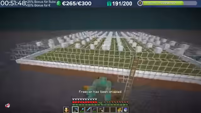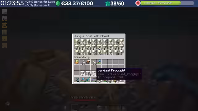 21:54:41Der Streamer plant, sich um die Farm zu kümmern und Froglights zu sammeln. Dafür benötigt er Leinen, die er vermutlich in einer Kiste verstaut hat. Er überlegt, neue Leinen herzustellen, falls er die alten nicht findet. Währenddessen wird die Gasfarm fertiggestellt und in der Nähe eine Froschlichtfarm gebaut, um Synergien zu nutzen. Die Effizienz der kombinierten Farmen wird diskutiert, wobei die Nähe der Magma-Farm möglicherweise die Geschwindigkeit beeinflusst. Es wird erwähnt, dass die Gasfarm im Test gut lief, mit permanent sterbenden Ghasts. Der Streamer bittet um Trapdoors für die Farm und plant, Kistenboote mit Froglights zurück zur Basis zu bringen. Die Idee einer Goldfarm ohne XP wird ebenfalls angesprochen, um die Ressourcen zu maximieren.