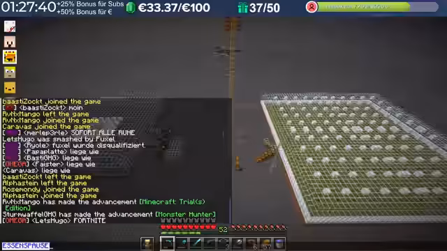 17:39:09Es wird die Serie 'Welcome to Derry' empfohlen, das Prequel zu 'Es', wobei auf die Splatter- und Gruselaspekte hingewiesen wird, die für empfindliche Zuschauer schwierig sein könnten. Die Atmosphäre der Serie wird als 'ziemlich geil' beschrieben. Die Goals im Stream werden manuell aktualisiert, da das verwendete Tool keine automatische Aktualisierung oder Soundeffekte bei Fortschritt bietet. Es wird ein weiteres Goal durch Spenden erreicht. Es wird auch erwähnt, dass viele Spieler aus Angst vor weiteren Bans dauerhaft online bleiben, um nicht erneut mit dem Problem konfrontiert zu werden. Die Situation um die Entbannungen wird als erledigt betrachtet, wobei der 'heiße Draht' zu Mojang als hilfreich empfunden wird.