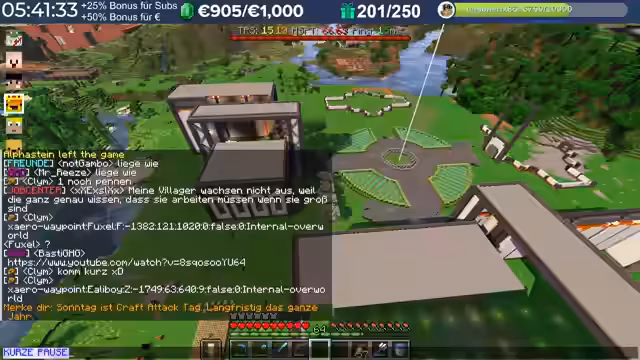 20:22:28Während des Baus wird über architektonische Details des 'Infinity Castles' diskutiert, wie beispielsweise Brückenverbindungen und Hauskonzepte, um die Mitte des Bauwerks zu füllen. Zudem wird auf technische Probleme mit der Farm-Logik eingegangen, da Villager verschwinden und Eisenfarmen nicht funktionieren. Als Ursache wird die fehlerhafte Mob AI vermutet, die ursprünglich zur Optimierung diente, aber zurückgesetzt wurde. Dadurch werden Spawn Chunks abgeschafft, was die Nutzung von Chunk Loadern notwendig macht, um Farmen am Laufen zu halten.