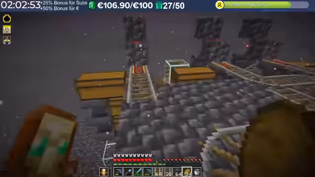 02:42:08Der Bau der Farm kommt voran, wobei die Mechanik des Anleinens von Kistenbooten über die Netherdecke als cool empfunden wird, um große Mengen an Materialien zu transportieren. Die Strecke zur Farm beträgt 1200 Blöcke, was mit Elytra später kein Problem mehr darstellen wird. Es wird über das Ende des Projekts diskutiert, welches auf den 7. November fällt, wobei Unklarheit über den genauen Wochentag besteht (Samstag, Sonntag oder Freitag). Die benötigten Materialien für die Farm, wie Powered Rails, Holz für Kisten und Sticks, sowie Glas und Ketten, werden gesammelt und vorbereitet. Es wird festgestellt, dass noch Quarz für Komparatoren und Honigblöcke fehlen, was eine weitere Reise zur Beschaffung dieser Ressourcen erfordert. Die Streamer scherzen über die fehlende Axt für einzelne Blöcke und die Schwierigkeit, Schienen richtig zu platzieren, wenn ein Komparator fehlt.
