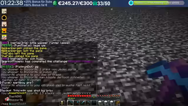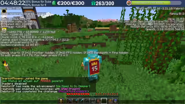 22:40:29Während Spark eine Essenspause macht, begeben sich andere Streamer auf eine Erkundungstour. Sie planen, einen Hammer und einen Trident zu farmen und suchen nach einer 'Twilight Chamber'. Die Streamer interagieren dabei mit Sparks Chat, da er sie nur hören, aber nicht sehen kann. Sie tauschen sich über die am wenigsten erkundeten Gebiete der Karte aus, wobei der Süden als vielversprechendes Ziel identifiziert wird. Es wird auch über die Funktionsweise des 'Happy Gas' für den Transport gesprochen. Die Gruppe entscheidet sich letztendlich für eine Reise in den Norden, um den Schnee zu sehen. Die Interaktion mit anderen Streamern und die gemeinsame Erkundung der Welt schaffen eine dynamische und unterhaltsame Atmosphäre, während Spark in seiner Pause ist.