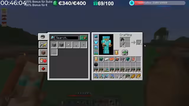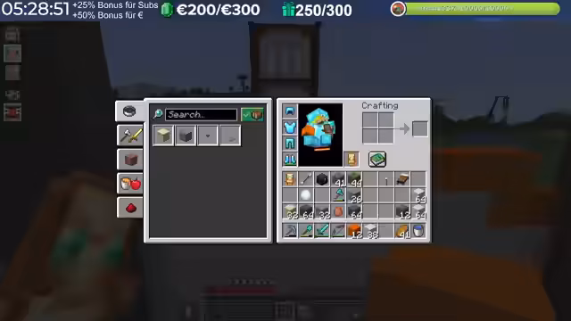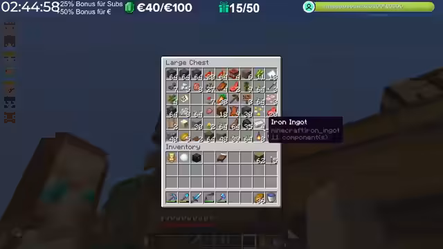 02:47:17Beim Craften der notwendigen Komponenten stellt sich heraus, dass noch wichtige Blöcke wie ein Comparator und Honigblöcke fehlen. Es werden auch noch mehr Kisten und Eisenstangen benötigt. Parallel dazu entstehen im Chat Diskussionen über andere Projekte auf dem Server und das Verhältnis zu anderen Spielern wie Schradin und Veni. Des Weiteren gibt es eine humorvolle Anfrage bezüglich einer Spende für ein TNT-Geschenk für einen anderen Streamer, die jedoch aufgrund fehlender Zielkoordinaten zunächst unklar bleibt und nicht umgesetzt wird.