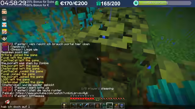 01:35:02Die Streamer bereiten den Transport von Glas und Fröschen zum geplanten Farmstandort im Nether vor. Es werden sieben Stacks Glas gesammelt und der Plan gefasst, die Frösche an Leinen durch ein Portal zur Nether-Decke zu führen. Die Diskussion über das Schlafen im Spiel, um die Nacht zu überspringen, führt zu Problemen, da nicht alle Spieler gleichzeitig schlafen. Es wird scherzhaft über die Jagd auf Phantome gesprochen, die bei Nicht-Schlafen spawnen. Der Transport der Frösche durch die Oberwelt gestaltet sich schwierig, da ein Frosch verloren geht und ein Skelett die Gruppe angreift. Die Route führt an einer unansehnlichen Drownfarm vorbei, deren Effizienz in Frage gestellt wird. Schließlich erreichen sie das Portal in der Nähe des Spawns, das zu einer neuen Basis führt, die als Kupferwürfel gestaltet ist und ein ME-System darstellen soll. Die Streamer planen, die Frösche und das Glas durch das Portal zu bringen, um die Farmen im Nether zu errichten.