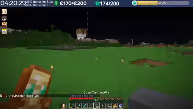 20:31:30Ein Bauprojekt, das eine Decke über dem Ender-Portal umfasst, wird besprochen. Es geht darum, "Smooth Sandstone Half Slaps" zu verwenden, die 15 Blöcke breiter als die Wassersäule sein sollen. Die Spieler diskutieren die Materialbeschaffung, insbesondere die Menge an gebranntem Sandstein, der "unendlich viel" vorhanden ist, da sie in der Wüste leben. Es wird auch über die Notwendigkeit einer Decke gesprochen, um eine dauerhafte Dunkelheit zu gewährleisten, damit mehr Mobs spawnen. Der Streamer plant sein eigenes Gebäude und benötigt dafür "Light Grey Terracotta" oder "Cyan Concrete", wofür er Farbstoffe wie Lapis und Grün verwendet. Die Materialbeschaffung und -verarbeitung sind zentrale Aspekte des aktuellen Baufortschritts.