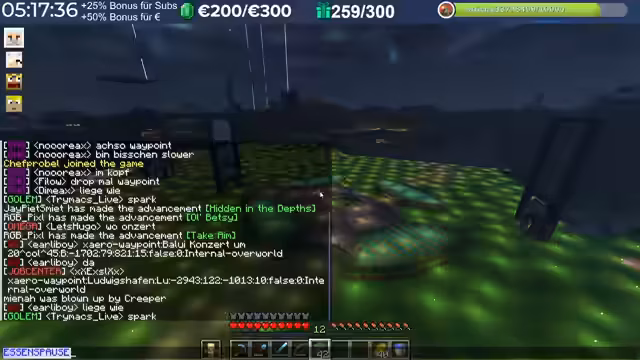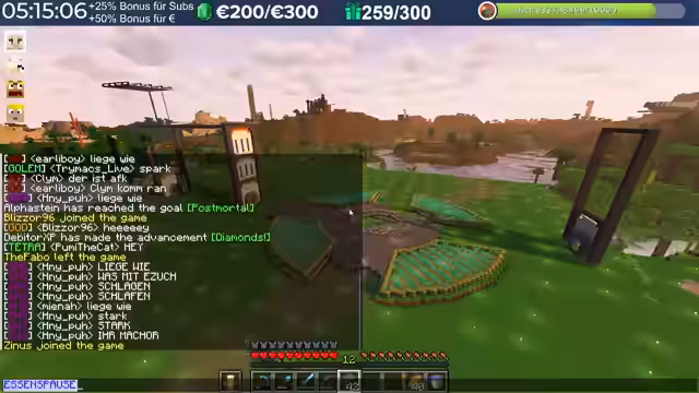 15:53:10Es geht um die Fortschritte bei Minecraft-spezifischen Herausforderungen. Das Team hat eine beachtliche Anzahl von Diamanten gesammelt, die sie für das Drachenheim benötigen. Das Drachenei muss erst in ein Phönix-Ei umgewandelt werden, bevor es schlüpfen kann. Gleichzeitig wird eine Blubber-Froschlichter-Farm geplant, die möglicherweise mit einer Ghast-Farm kombiniert werden kann, um Ressourcen wie Pulver und Ghastruten effizient zu sammeln. Es taucht auch ein Rätsel auf, bei dem Hunde eines Spielers verschwunden sind, was eine Untersuchung und möglicherweise eine serverinterne Aufklärung auslöst.