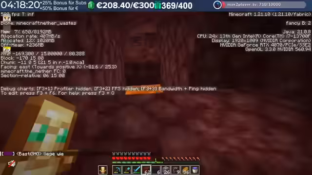 17:38:48Es wird über die Beschaffung von Netherite Scrap gesprochen, wobei der Streamer selbst keine hat und nur eine Netherite-Rüstung besitzt. Es wird erwähnt, dass Netherite-Rüstungen oft von Anfängern genutzt werden, während erfahrenere Spieler auch mit Diamant-Rüstungen zurechtkommen. Ein Zuschauer bemerkt das Sortiersystem des Streamers, das als 'illegal' und 'externe Modifikation' bezeichnet wird, obwohl es sich um ein normales Wechselsortiersystem handelt. Die Diskussion über das Sortiersystem zeigt die unterschiedlichen Ansichten über erlaubte Modifikationen im Spiel. Später wird auch über die Schwierigkeiten beim Finden von Ancient Debris im Nether gesprochen, wobei Monte dem Streamer geholfen hat, diese zu finden. Der Streamer selbst hat in der Vergangenheit große Mengen Ancient Debris gefarmt und weiß, wie man sie effizient findet.