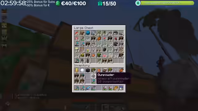 20:50:18Nachdem die Spieler am Vortag nicht spielen konnten, hat einer der Streamer aus Frust Singleplayer-Farm-Tutorials für eine Ghast-Farm (für Gunpowder und Ghast-Tränen) und eine Forklide-Farm aufgenommen. Es wird die Effektivität einer Ghast-Farm für Gunpowder diskutiert und die Schwierigkeit, eine solche Farm in der Nähe des Spawns zu bauen, wenn bereits andere Farmen existieren. Ein Spieler bietet an, Wither-Rosen für eine Farm zu besorgen, die für Happy Gas und Raketen-Gunpowder benötigt werden. Es wird geschätzt, dass etwa 144 Wither-Rosen benötigt werden, wobei ein paar mehr für den Fall der Fälle wünschenswert wären. Die Beschaffung der Wither-Rosen wird für den nächsten Abend zugesagt.
