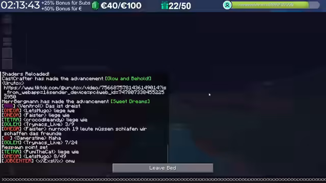 18:05:13Es wird eine Diskussion über den Nachtzyklus im Spiel geführt, insbesondere darüber, dass Max sich weigert, schlafen zu gehen, obwohl er andere dazu auffordert, um Phantome zu vermeiden. Dies führt zu Frustration, da Max selbst unter den Phantomen leidet, aber die einfache Lösung des Schlafens ignoriert. Die Anwesenden versuchen, ihn dazu zu bewegen, sich ins Bett zu legen, um das Problem zu lösen, da es alle anderen betrifft. Es wird auch über die Möglichkeit gesprochen, einen Ghast als Transportmittel zu nutzen, indem man ein Boot und eine Leine daran befestigt, um Gegenstände zu transportieren. Die Idee, mehrere Kistenboote an einem Ghast zu befestigen, um mehr Stauraum zu haben, wird ebenfalls erörtert.