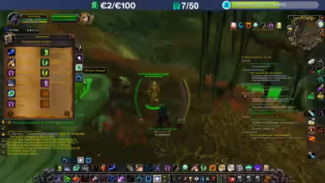 06:17:10Die Aktivitäten konzentrieren sich auf das Farmen von 'Ungoro Erde' und 'Brühschlamm' für spezifische Quests im Gebiet Un'Goro. Die Quests erfordern das Sammeln und anschließende Füllen von Glasflaschen. Dabei wird ein hohes Mana-Problem festgestellt, da das Verlassen der Tiergestalt sehr kostspielig ist. Die Monster im Gebiet sind gefährlich und können hohe Schadenssalven austeilen.