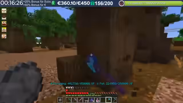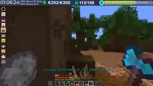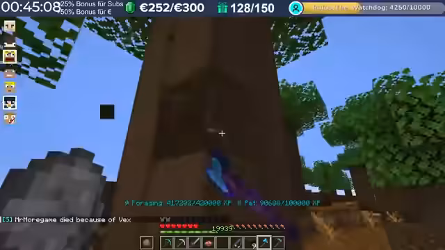 18:30:01Die zweite Projekthälfte beginnt mit einem neuen Ziel, das niemand erraten wird: Skulk. Nach anfänglichen Schwierigkeiten wird das Ziel durch die gemeinsame Anstrengung der Spieler erreicht. Als Belohnung steht der Wald wieder zur Verfügung, und die Spieler können daraus Ressourcen wie Holz ernten. Klim wird empfohlen, die Items aus seinem Inventar komprimieren zu lassen, da die Ressourcen schwer zu lagern sind. Der Waldarbeiter bittet um Nachforschungen bezüglich der Illiger-Sprache, da man im Waldanwesen immer von den Illigern rausgejagt wird. Für den Beitrag zum Wald erhalten drei Spieler eine Belohnung, darunter Level und Sparks. Die neue Ressource wird Dark Oak sein, die in einem selbstgebauten Wald geerntet werden kann. Die Spieler können die Welt nicht mehr verändern und befinden sich im Adventure-Mode, ähnlich wie in der Mine. Das Holz erneuert sich von alleine, und die Axt muss vom Waldarbeiter für 10.000 Level überarbeitet werden, um im Wald bauen zu können. Der Streamer erklärt, dass er den selbstgebauten Wald in eine sich selbst erneuernde Ressource umgewandelt hat, was einen kreativen Ansatz darstellt.