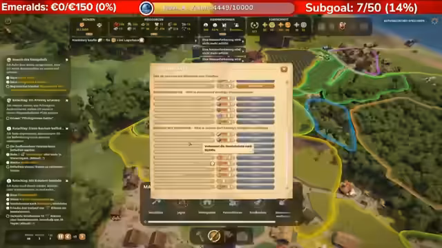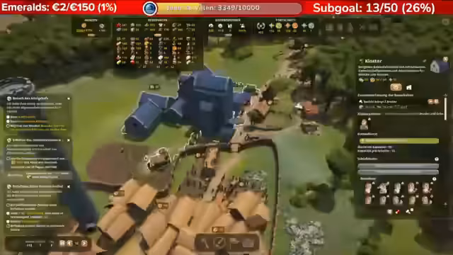 00:25:30Nach und nach schafft es der Streamer, das Ruder herumzureißen. Er erreicht wieder einen positiven Geldfluss von über 1000 Goldmünzen und baut die Bevölkerung wieder auf über 300 Einwohner aus. Die Handelsrouten werden verbessert, um die Einnahmen durch den Verkauf von Rohstoffen wie Gold und Marmor zu steigern. Das Hauptziel ist nun, die Burg aufzustocken, um den "Königreichsprunk" auf 300 zu bringen und das Spiel fertigzuspielen.