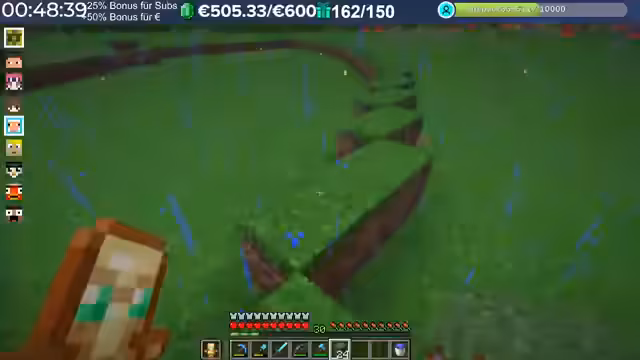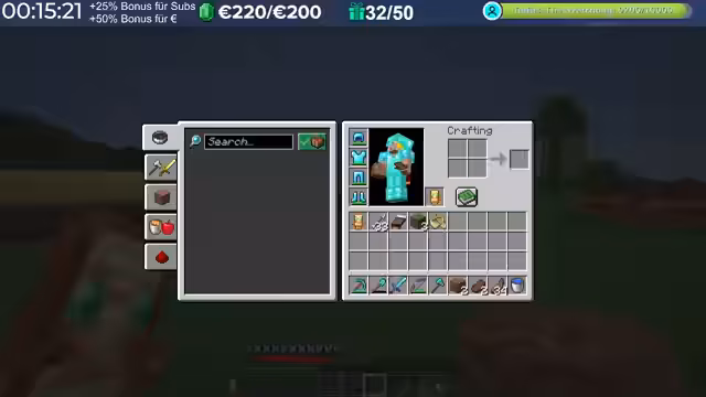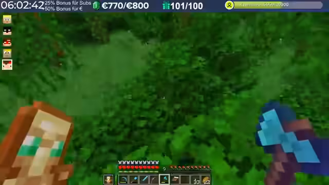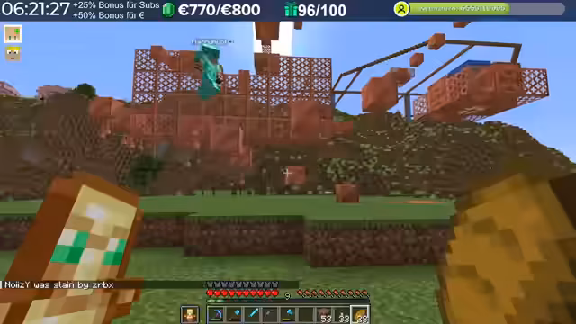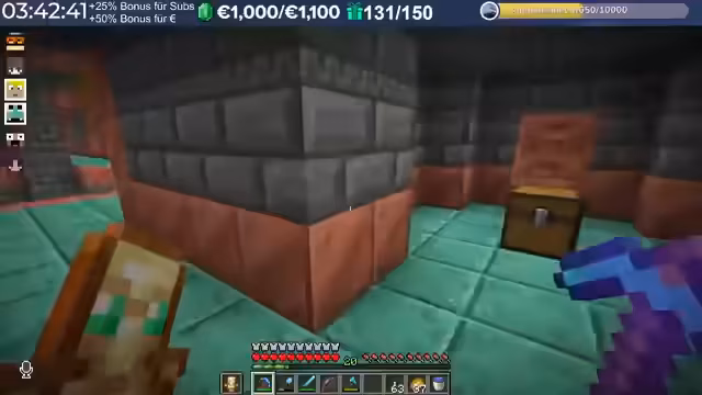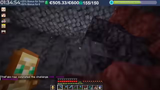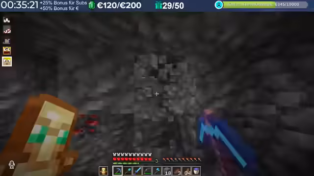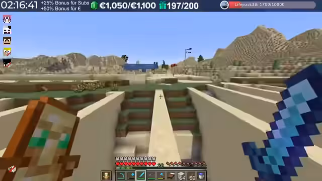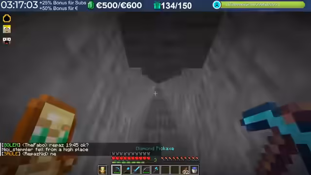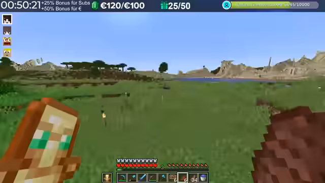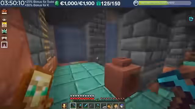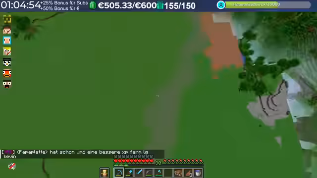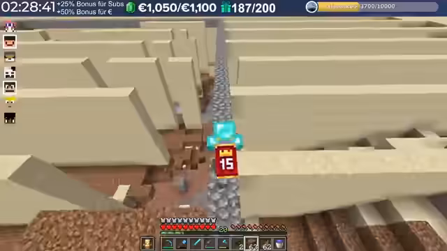 21:17:40Ein interaktives Jump 'n' Run wurde gestartet. Die Teilnehmer mussten zusammenarbeiten, indem sie abwechselnd Sprünge durchführten. Für den Erfolg waren strikte Regeln vorgegeben: keine Tricks wie Windcharges oder Wasser, und maximal drei Fails erlaubt. Als Belohnung für das Durchführen der Strecke ohne Fails wurden drei Subs versprochen. Trotzdem wurde die Herausforderung als intensiv und schwierig empfunden.