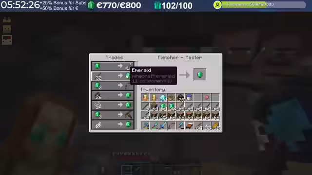 20:55:02Es wird intensiv an Handelsfarmen für Emeralds gearbeitet. Das Ziel ist es, Villager zu organisieren, die Rotten Fish gegen Emeralds eintauschen. Ein funktionierendes System mit zwei Villagern, Weizenfeldern, speziellen Blöcken, um die Villager klein zu halten, und Betten für die Vermehrung ist in Planung. Das System soll es ermöglichen, kontinuierlich Villager zu traden und wieder zu ersetzen, um einen konstanten Handelsfluss zu gewährleisten.