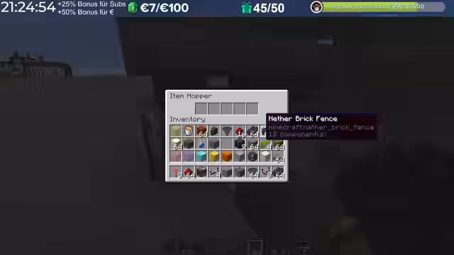 17:23:08Es wird intensiv an der Optimierung eines Mechanismus zur Verarbeitung von Kelp gearbeitet. Ursprünglich sollten sieben Items übrig bleiben, doch nach verschiedenen Anpassungen und Tests, inklusive dem Hinzufügen und Entfernen von Repeatern und dem Justieren von Kondensatoren, bleiben neun Items übrig. Es stellt sich heraus, dass ein falsch herum gebauter Comparator das Problem verursacht hat, was zu einer zu hohen Anzahl an verbleibenden Items führte. Ziel ist es, exakt 20 Items durchzuschleusen, wobei der Kondensator vollständig geladen werden muss, um eine präzise Dosierung zu gewährleisten. Nach weiteren Versuchen und Anpassungen der Redstone-Schaltung, bei der die Pulsdauer verlängert und Kurzschlüsse behoben wurden, bleibt die Anzahl der Items weiterhin inkorrekt. Die Herausforderung liegt in der präzisen Abstimmung der Signalstärke und der Timing-Frage, um die gewünschte Menge an Items zu erhalten.