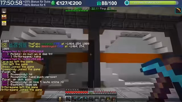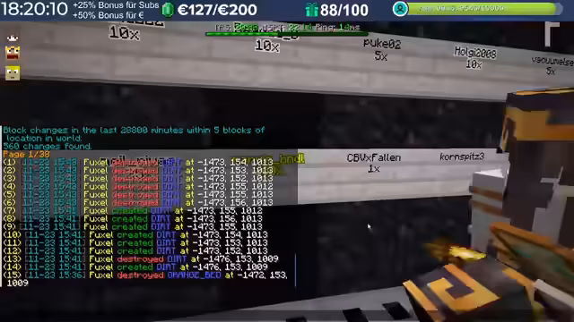 15:21:55Ein Rätsel um einen Eisen-Shop-Scam wird gelöst. Ein Spieler hatte sich drei Stacks Eisenblöcke genommen, aber nur drei Tears als Bezahlung hinterlassen, anstatt der erwarteten Menge. Der Streamer hatte dies zunächst falsch interpretiert, da er dachte, es fehle nur ein einzelner Block. Die Person, die den Scam begangen hatte, gab an, verpeilt gewesen zu sein. Im Discord gibt es einen neuen Channel für Feature-Requests, wo Vorschläge für Plugins, Karten oder andere Ergänzungen für Craft Attack gesammelt werden. Es wird über eine Website mit einer Map diskutiert, die Strukturen scannen könnte, wobei der Streamer die Idee einer einfachen Spawn-Map bevorzugt, um nicht zu viele Informationen preiszugeben, die das Spielerlebnis beeinträchtigen könnten.