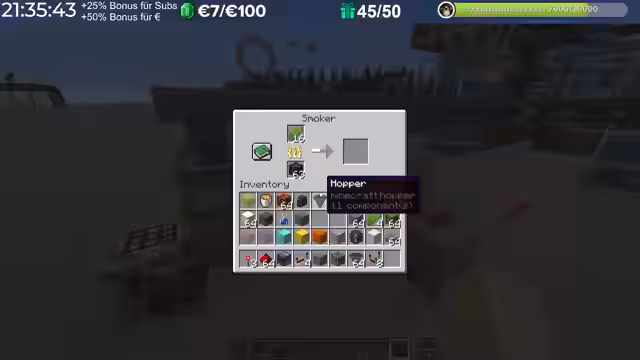 17:35:39Aufgrund der Schwierigkeiten bei der präzisen Dosierung mit der bisherigen Redstone-Schaltung wird die Implementierung einer Hopper-Clock in Betracht gezogen. Diese soll eine feinere Justierung des Timers ermöglichen, da sie direkt über die Anzahl der Items in den Trichtern gesteuert wird. Die Hopper-Clock wird so konfiguriert, dass sie 10 Items hin und 10 Items zurückschaufelt, bevor das Signal ausgeschaltet wird. Nach dem Einbau und der ersten Testphase zeigt sich, dass die Hopper-Clock effektiv 20 Items dosiert, wobei ein Rest von 3 Items verbleibt. Dies wird als Erfolg gewertet, da die Hopper-Clock als Schutzmechanismus fungiert, der einen Überschuss an Items pausiert und so eine effiziente Dosierung von 20er-Paketen gewährleistet. Die Anlage wird nun als funktionierender Dosierer betrachtet, dessen Technik weiter optimiert und kompakter gebaut werden soll, um Dried Kelp effizient zu schmelzen.