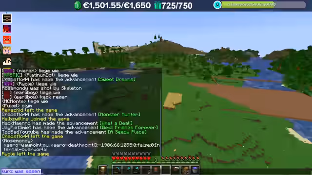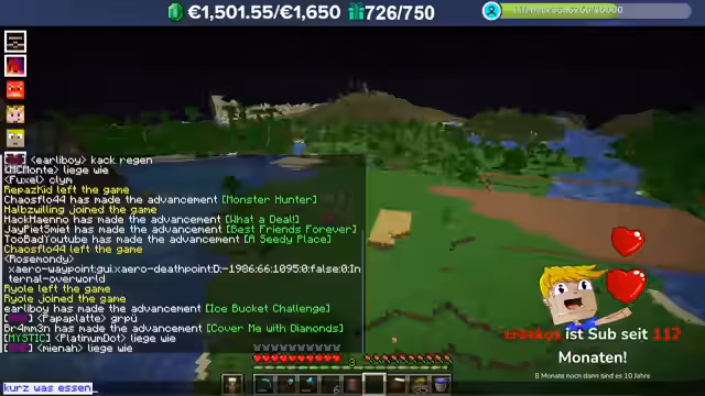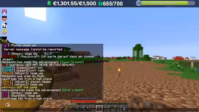 07:32:25Ein Teilnehmer äußert seine Sorge über den Mangel an Ressourcen wie Kohle, die 4.000 Blöcke entfernt ist, was die Effizienz beeinträchtigt. Es wird eine Diskussion darüber angestoßen, wie man das Problem der mobilen Handelsrouten lösen kann, um den Zugang zu Villagern und deren Dienstleistungen zu erleichtern. Gleichzeitig entstehen neue Allianzen und das Konzept von Schutzgeldzahlungen wird thematisiert, was die komplexen sozialen Dynamiken auf dem Server widerspiegelt und zeigt, wie die Teilnehmer ihre eigenen Regeln und Strukturen schaffen.