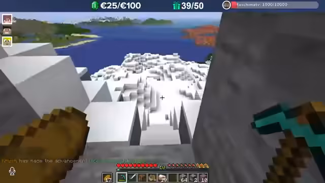 00:52:03Der Streamer erkundet gemeinsam mit zwei anderen Spielern drei verbundene Dörfer, um auf den Bergen nach Eisen zu suchen. Die Strategie beruht auf der Annahme, dass in den höheren Lagen der Berge mehr Rohmaterialien vorkommen. Die Kletterei wird durch Schnee und Eis erschwert, doch es wird beharrlich weiter gesucht, um die notwendigen Ressourcen für das Create-Projekt zu sammeln. Das Ziel ist es, eine ausreichende Menge Eisen für die anstehenden Bauvorhaben zu sichern.