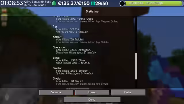 00:52:52Nach einem kurzen Testlauf am Ende der Dungeon-Ebene 3 stellt der Streamer fest, dass man dort pro Minute etwa 1000 Level durch den Kampf gegen Enderman erhält, was einer Rate von 60.000 XP pro Stunde entspricht. Der Ertrag ist dabei hoch, allerdings werden auch Mana-Tränke verbraucht. Gleichzeitig teilt er mit, dass es für sein Projekt Colonies keine weiteren Folgen geben wird. Für die Zukunft plant er eine längere Sommerpause, möglicherweise mit Videos, aber ohne regelmäßige Streams, da er ein größeres Real-Life-Projekt hat.