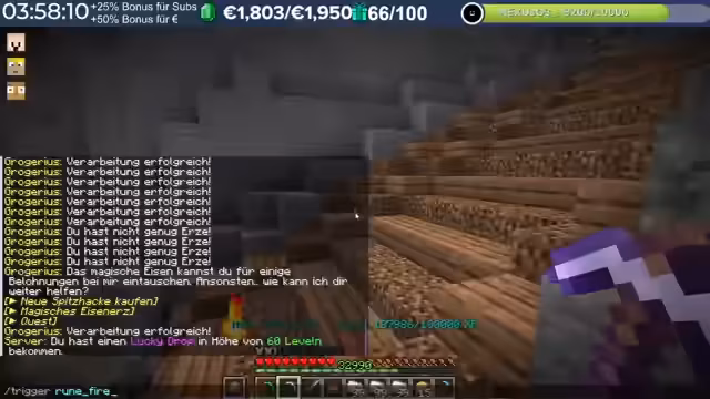 20:20:44Es wird erörtert, dass Eisen nun wichtiger ist, um Ausrüstung zu reparieren, was die Wirtschaft ankurbelt. Spieler können Eisen abbauen und es an andere verkaufen, die keine Zeit zum Farmen haben. Es entstehen verschiedene Spielertypen: Kämpfer, Boss-Jäger und Farmer. Mittelsmänner können Eisen verarbeiten und verkaufen. Der Markt bietet die Möglichkeit, benötigte Ressourcen zu kaufen, um Zeit zu sparen. Es wird überlegt, den Boss anzugreifen, aber es fehlen die Runen. Zombies können Runen droppen, die im Markt erhältlich sind. Die Feuerruhne kostet 10k Level, während die Wasserruhne teurer ist. Es wird überlegt, ob die Feuerruhne für Heilung genutzt werden kann. Der Streamer parodiert RP und seine Abneigung gegen Magie. Bei den Endermännern gibt es gute Drops. Es wird eine Runenschriftrolle mit einem Totenkopf gefunden, die als selten gilt. Es wird diskutiert, dass diese Rune möglicherweise noch angepasst werden muss, da sie zu stark sein könnte. Es wird überlegt, ob man bis 50k farmen und dann zum Magier gehen soll. Der Streamer findet es unlogisch wegen 1000 Leveln zu geizen.
