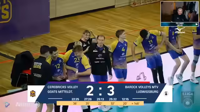 02:34:53Das Spiel nahm einen dramatischen Verlauf, als die Volleygoats im dritten Satz eine große Führung verspielten. Der Streamer sprach von einem "Fehlerfestival" und beschrieb, wie die Goats am Ende den Satz verloren. Auch im vierten Satz lief es für Ludwigsburg zunächst nach Plan, doch die Goats kämpften sich zurück und zwingen den Gegner in einen entscheidenden fünften Satz. Der Streamer zeigte sich beeindruckt von der kämpferischen Leistung und prophezeite einen krampfigen, aber spannenden finalen Satz.