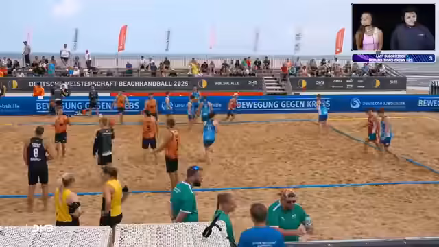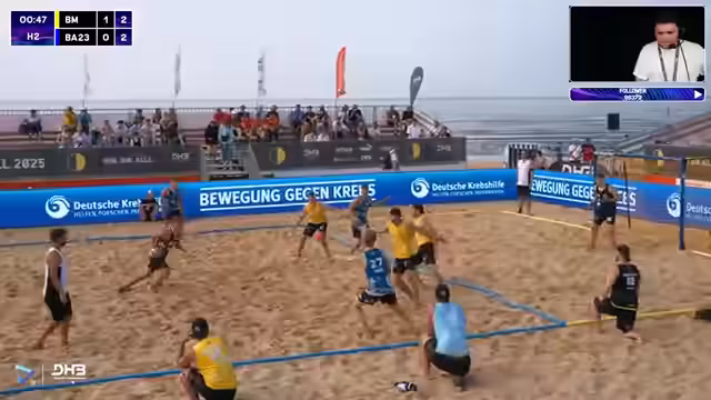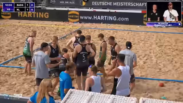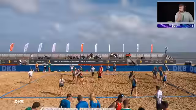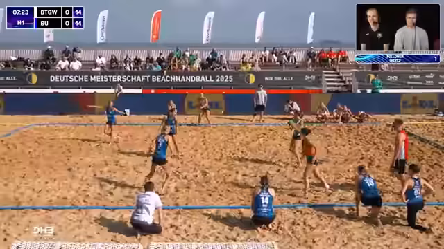 01:12:19Der Stream startet mit einer Prognose für die Deutsche Meisterschaft und hebt die Überraschungsleistung der Despos aus dem Vorjahr hervor. Das aktuelle Spiel zwischen den Beach Tigers und den Beach Unicorns beginnt ausgeglichen bei 10:10. Kommentatoren analysieren die taktischen Bewegungen auf dem Feld. Die Tigers gehen erstmals in Führung und setzen eine 2-1-Verteidigung ein, um Druck auf den gegnerischen Ball aufzubauen und erfolgreiche Aktionen zu erzwingen.