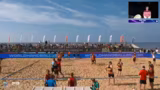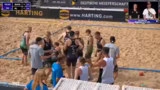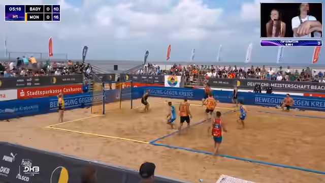 10:01:09Die Männer-Begegnung zwischen den Beach Moppeten und den Beach Bazis endet nach zwei Sätzen mit einem klaren 32:20 für die Moppeten. Kommentatoren loben die konsequente und effiziente Spielweise der Moppeten, die jede Chance nutzen. Die Bazis, die den ersten Satz ebenfalls deutlich verloren, konnten im zweiten Satz nicht mehr anknüpfen und sich nicht zurückkämpfen. Der Sieg sichert den Moppeten den Einzug in die Viertelfinale.