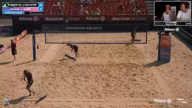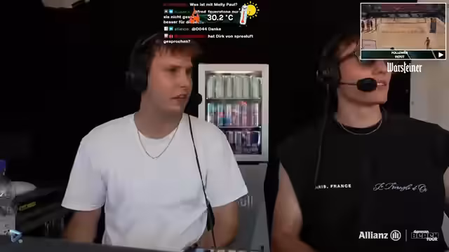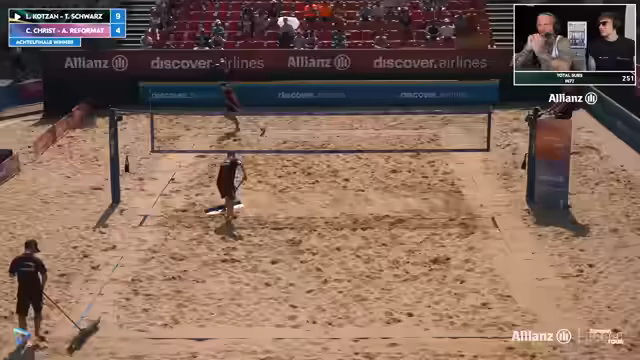 10:15:31Im Stream wird der deutsche Beachvolleyball-Star Johannes Tille vorgestellt, der das Spektakel genießt. Es gibt eine Diskussion über dievisibility der Spieler und technische Aspekte. Die Atmosphäre ist aufgelockert mit privaten Kommentaren und humorvollen Einwürfen. Die Kameraeinstellungen und andere technische Details werden angesprochen, was zeigt, dass das Event gut organisiert ist, aber auch einige Herausforderungen mit sich bringt.