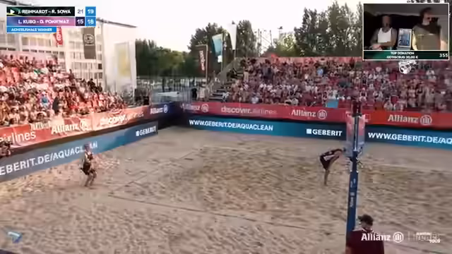 06:17:11Es gibt ein neues Sponsorship mit Britstick, was sich in der neuen Kappe der Spieler zeigt. Thilo hat in München seine Kappe verloren, aber die neue Lösung mit mehr Grip hält besser. Manu Harms zeigt eine überragende Leistung mit einer Angriffsquote von fast 60 Prozent und sechs Killblocks. Thilo und Momme erreichen den Loserbaum mit Matchball, aber am Ende gewinnen Manu Harms und Janik Harms mit 37,5 zu 22 Punkten.