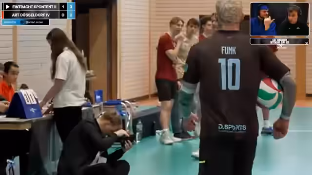 00:30:00Mit dem zweiten Satz beginnt der Kommentator, die fehlende Karnevalsmusik zwischen den Sätzen zu bemängeln und fordert den DJ auf, Musik einzuspielen, um die Stimmung aufrechtzuerhalten. Das Spiel selbst ist weiterhin von technischen Mängeln geprägt, aber auch von spielerischen Highlights. Dirk Funk trifft weiterhin viele Punkte, während die Abwehr von ART IV Fehler macht. Der Kommentator startet eine Aktion im Chat, bei der die Zuschänger ihre besten Karnevalskostüme vorstellen sollen, und berichtet von lustigen und ungewöhnlichen Auftritten auf dem Spielfeld.