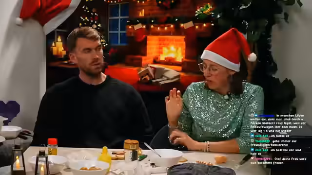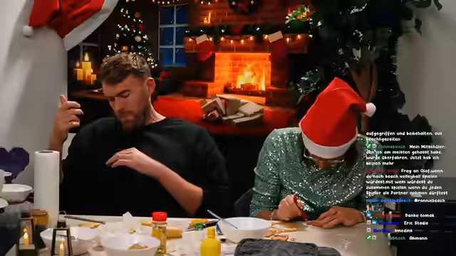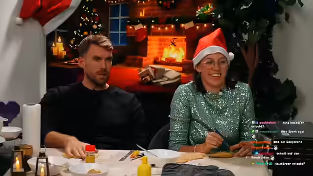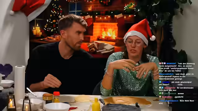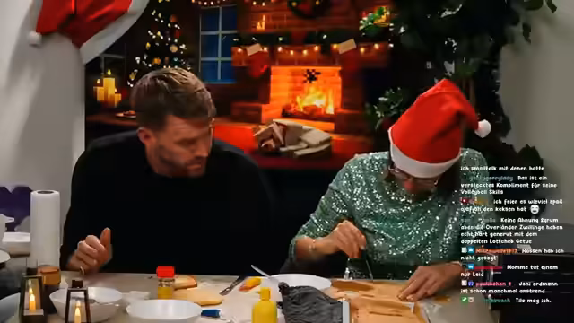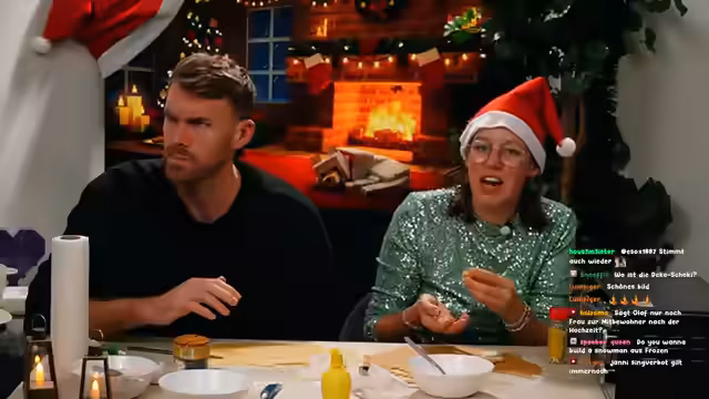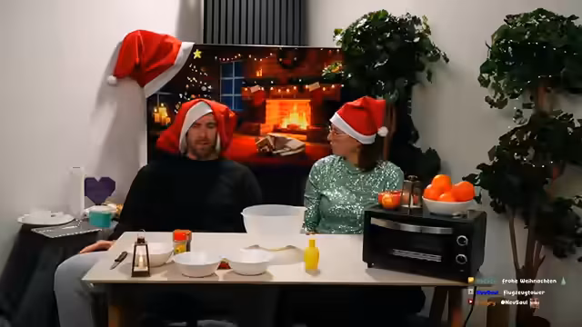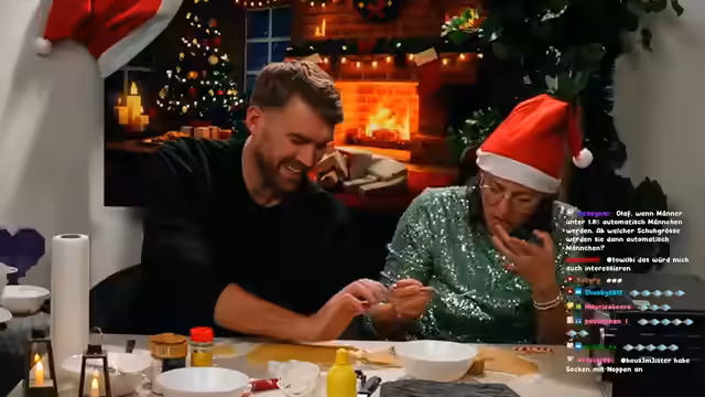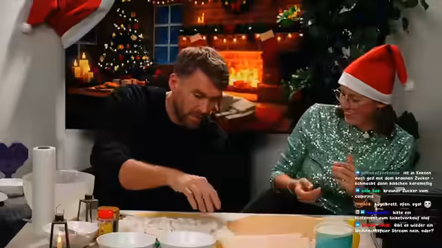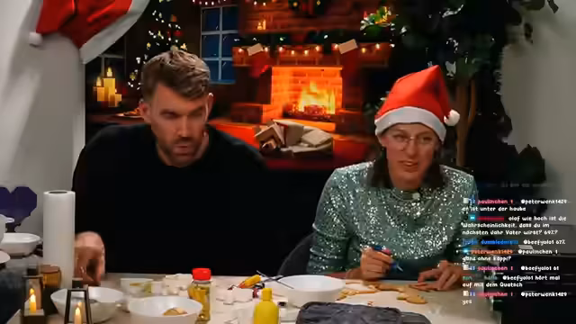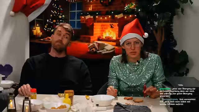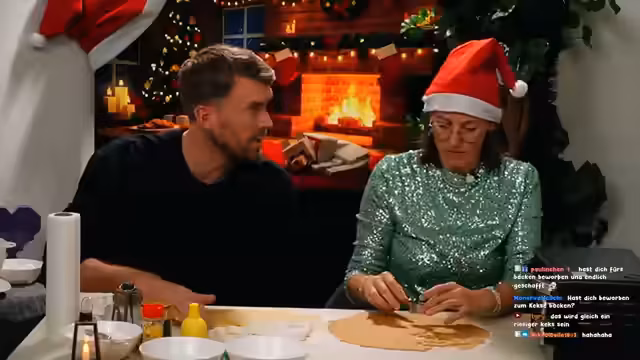 00:08:08Die Streamer beginnen ihren Live-Stream mit dem Thema Weihnachtsplätzchen backen. Dabei wird das Studio-Setup kritisiert, da es unbequem sei, aber dennoch als „muckelig“ empfunden wird. Es wird gescherzt, dass das Studio während des Backens abfallen könnte. Ein Ofen wurde extra für den Stream angeschlossen, wobei Bedenken geäußert werden, dass dies die Handballkonferenz im Untergeschoss stören könnte. Es wird versichert, dass alle Sicherungen überprüft wurden, um solche Probleme zu vermeiden. Die Atmosphäre ist locker und humorvoll, während die Vorbereitungen für das Backen getroffen werden.