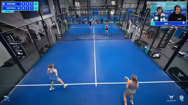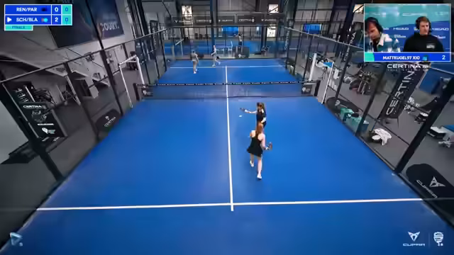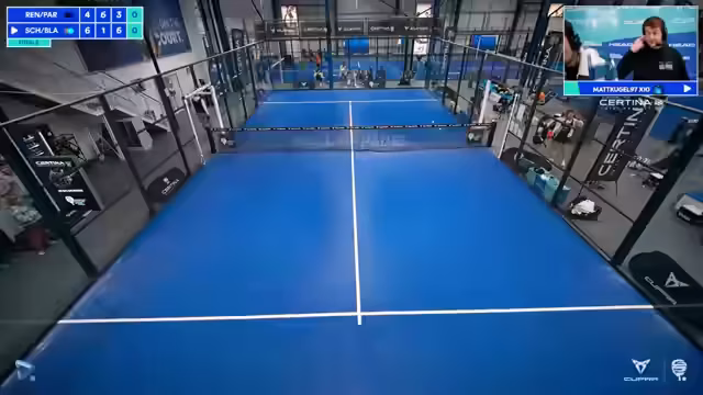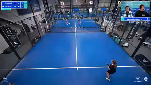 00:00:02Der Stream beginnt mit der Ankündigung des ersten Finales der CERTINA German Padel Tour in Braunschweig. Im Vordergrund sind Herr Schmitz und Mila Blaschka zu sehen, während auf der anderen Seite die topgesetzten Luciana Renic und Rea antreten. Der Kommentator erwartet ein spannendes Duell und bittet den Chat um Bestätigung, dass Audio und Video funktionieren.