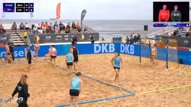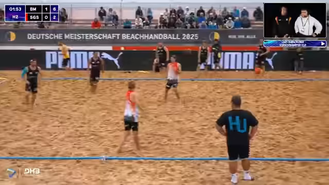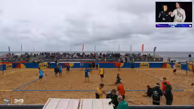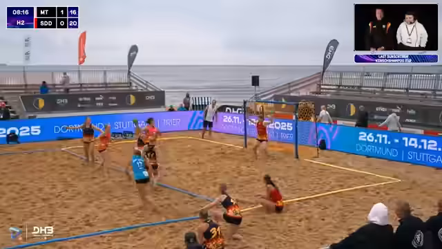 00:10:24Der Stream startet in Cuxhaven bei regnerischem Wetter. Die Knockout-Phase beginnt mit den Viertelfinalspielen der Männer und Frauen. Der Kommentator erwähnt, dass der Strandkorb über Nacht nass geworden ist, aber die Stimmung trotzdem gut ist. Es gibt Personalveränderungen im Team der Frauen mit Isi Kattner, Belen Gedward und Lena Klingler. Der Bundestrainer war von der Leistung der Batis beeindruckt, besonders von Isi Kattner auf der Außenposition.