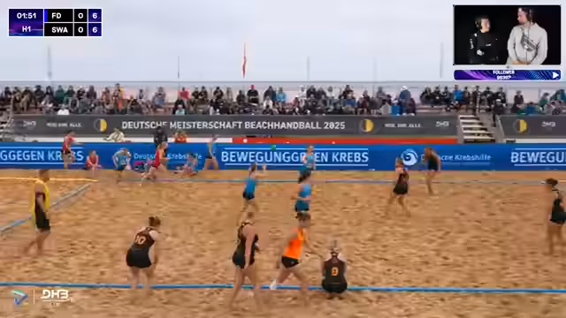 05:47:46Die Atmosphäre im Finale ist elektrisierend mit über 1000 Zuschauern. Die Tribünen sind voll und die Unterstützung für beide Teams ist enorm. Die Kommentatoren heben die besondere Stimmung hervor und betonen die Bedeutung des Finalspiels als Abschluss der Beach-Handball-Saison. Beide Teams bringen ihr bestes Niveau, was ein absolutes Highlight verspricht. Die deutsche Nationalhymne beschließt die Ehrerbietung vor Spielbeginn.