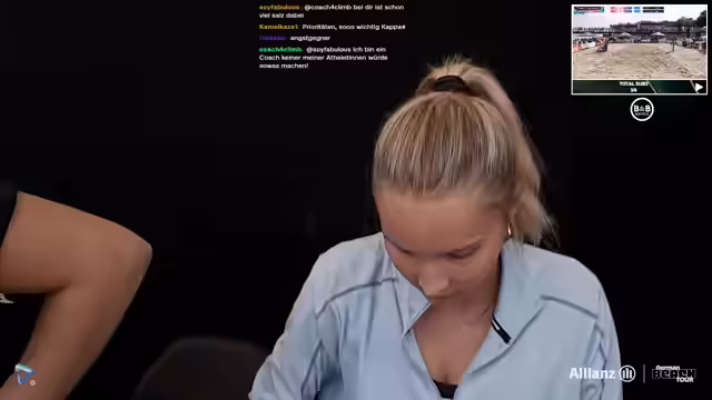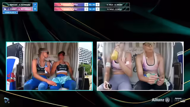 01:11:17Im letzten Frauenspiel des Tages auf Court 2 treten Chinoa Christ/Anna Chiara Reformat gegen Lisa Kotzahn/Tabi an, um den neunten Rang zu ermitteln. Der Kommentator betont die hohe Qualität der Deutschen Meisterschaften im Vergleich zur normalen GBT-Saison und würdigt den langjährigen Erfolg von Teams wie Clemens Wickler, der nach einer Schiri-Entscheidung auf dem Center Court ausgerastet ist. Das Spiel startet ausgeglichen mit starken Aktionen auf beiden Seiten: Chinoa zeigt starke Block- und Angriffsleistungen, während Lisa und Tabi noch einige Unzuverlässigkeit im Zuspiel zeigen. Eine Herausforderung (Challenge) wird nicht erfolgreich geführt, was die Wertung bestätigt.
