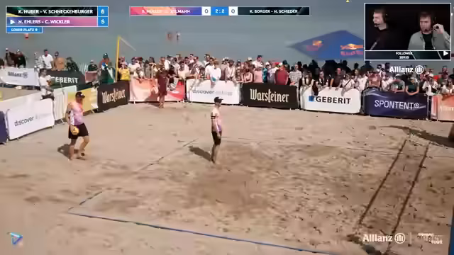 02:04:52Das Spiel zwischen Kim/Valentin und Nils Ehlers/Clemens Wickler beginnt vor einer ungewöhnlich großen Menschenmenge. Die Beobachter bezeichnen die beiden Spieler Kim und Valentin als klare Außenseiter gegen die Topgesetzten Ehlers und Wickler. Die Atmosphäre wird als elektrisch beschrieben, mit vielen Zuschauern, die sich um die Hauptkamera drängen. Es wird über die technischen Herausforderungen der Übertragung diskutiert, einschließlich der Anpassung der Kameraeinstellungen, um die Action besser einzufangen. Das Spiel zeigt früh erste spannende Rallyes, die von den Kommentatoren intensiv begleitet werden.