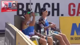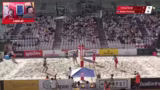 03:05:37Das Spiel verläuft äußerst intensiv und körperbetont. Es kommt zu einem strittigen Punkt, bei dem Matthias Seiser den Ball an der Netzkante für sich reklamiert, während Schiedsrichterin Andy Lippe anders entscheidet. Seiser argumentiert als Lehrer physikalisch für seine Sichtweise, was Lorenz Krössig sichtlich wütend macht. Der Kommentator stimmt Seisers Analyse zu, hält die Entscheidung für falsch, betont aber, dass solche knappen Situationen im Beachvolleyball passieren können.