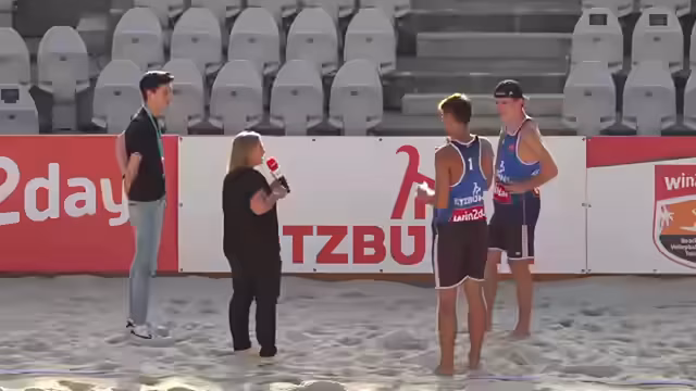 03:51:36Nach dem packenden Halbfinale wird ein kurzes Interview mit den Gewinnern Chris Dressler und Philipp Waller geführt. Dressler, amtierender Staatsmeister, gibt an, dass das Team gut drauf sei und einen weiteren Titel anstrebt. Waller erwähnt, dass er bald 30 wird und sich ein goldener Titel zum Geburtstag wünsche. Der Kommentator blickt auf das anstehende Finale zwischen Dressler/Waller und den Siegern des anderen Halbfinales, Timo Hammerberg und Tim Berger, und verspricht ein Spektakel.